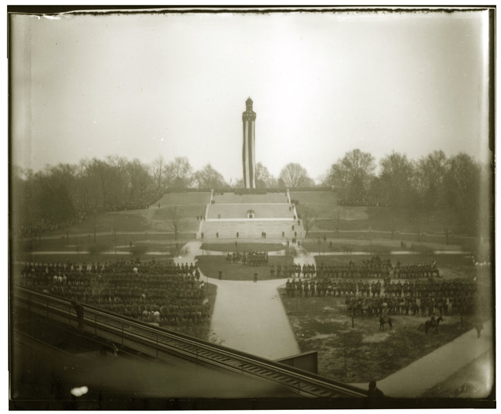 The 1908 unveiling ceremony of the Prison Ships Martyrs Monument in Fort Greene Park. The photo was taken by Brooklyn photographer Clifford Irving Jones from the Myrtle Avenue EL train station (notice the tracks). The event was attended by 30,000 people featuring a wide range of dignitaries including President Taft. Crowds of spectators can be seen lining either side of the hill and the park.